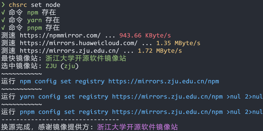 chsrc set node 或 set npm / nodejs / yarn / pnpm # 同时换这3个