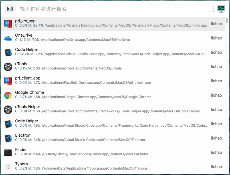 重启进程功能进入插件后列出所有进程方向键进行列表选择按内存排序添加对 macOS 的支持